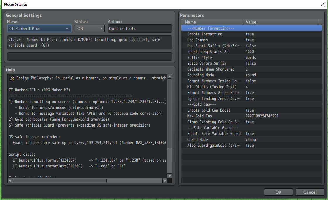 | Tags | cynthia-tools, Incremental, number-formatting, plugin, rmmz-plugin, RPG Maker, RPG Maker MZ, rpgmaker-mz-plugin, rpgmaker-plugin |